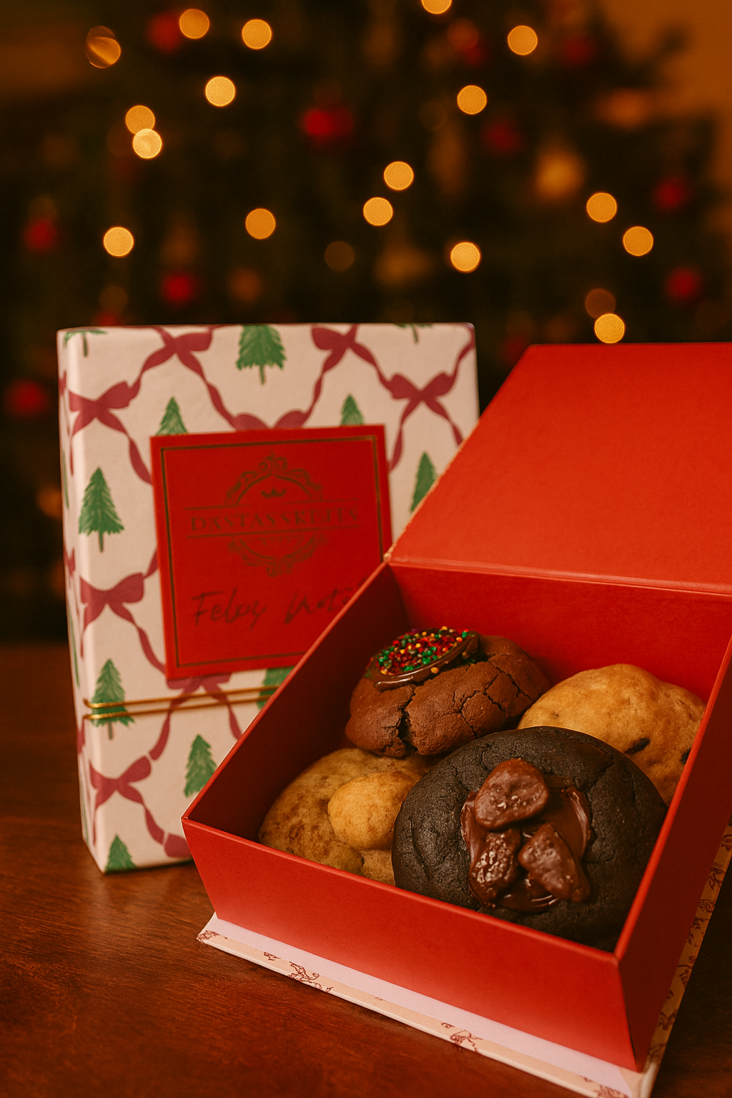 1 caixa natalina com 4 cookies (consultar a disponibilidade dos sabores)